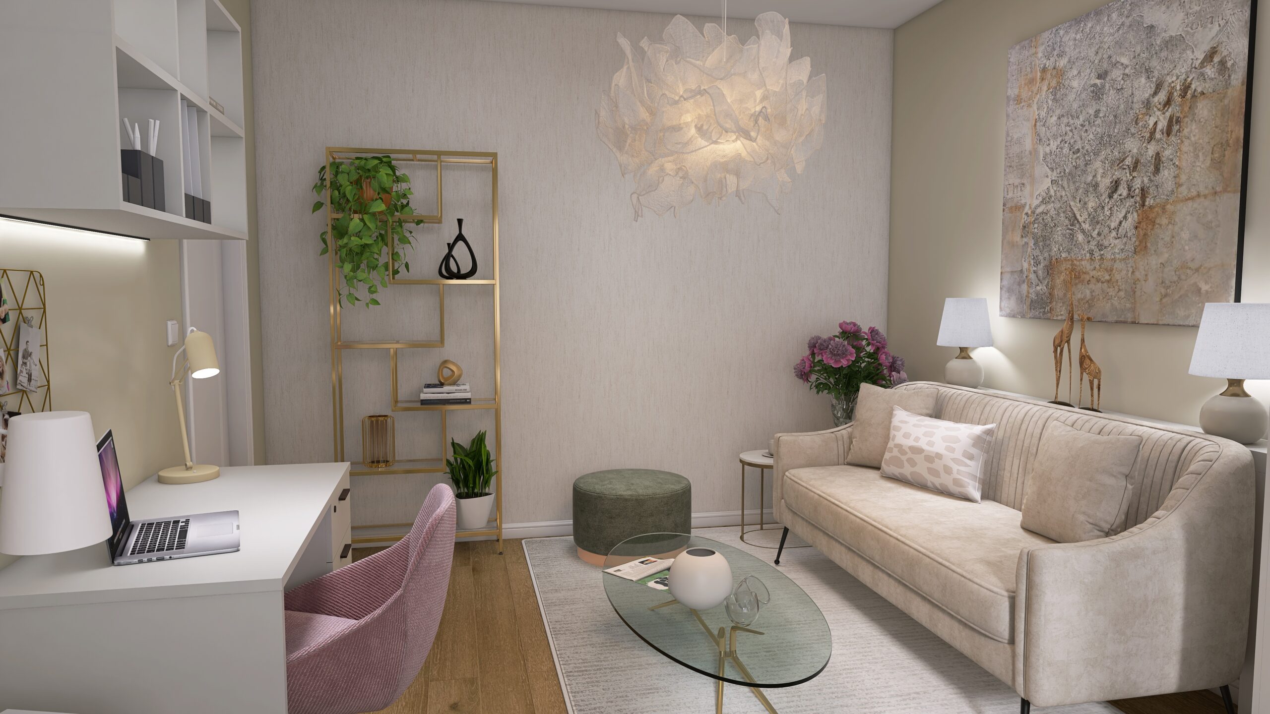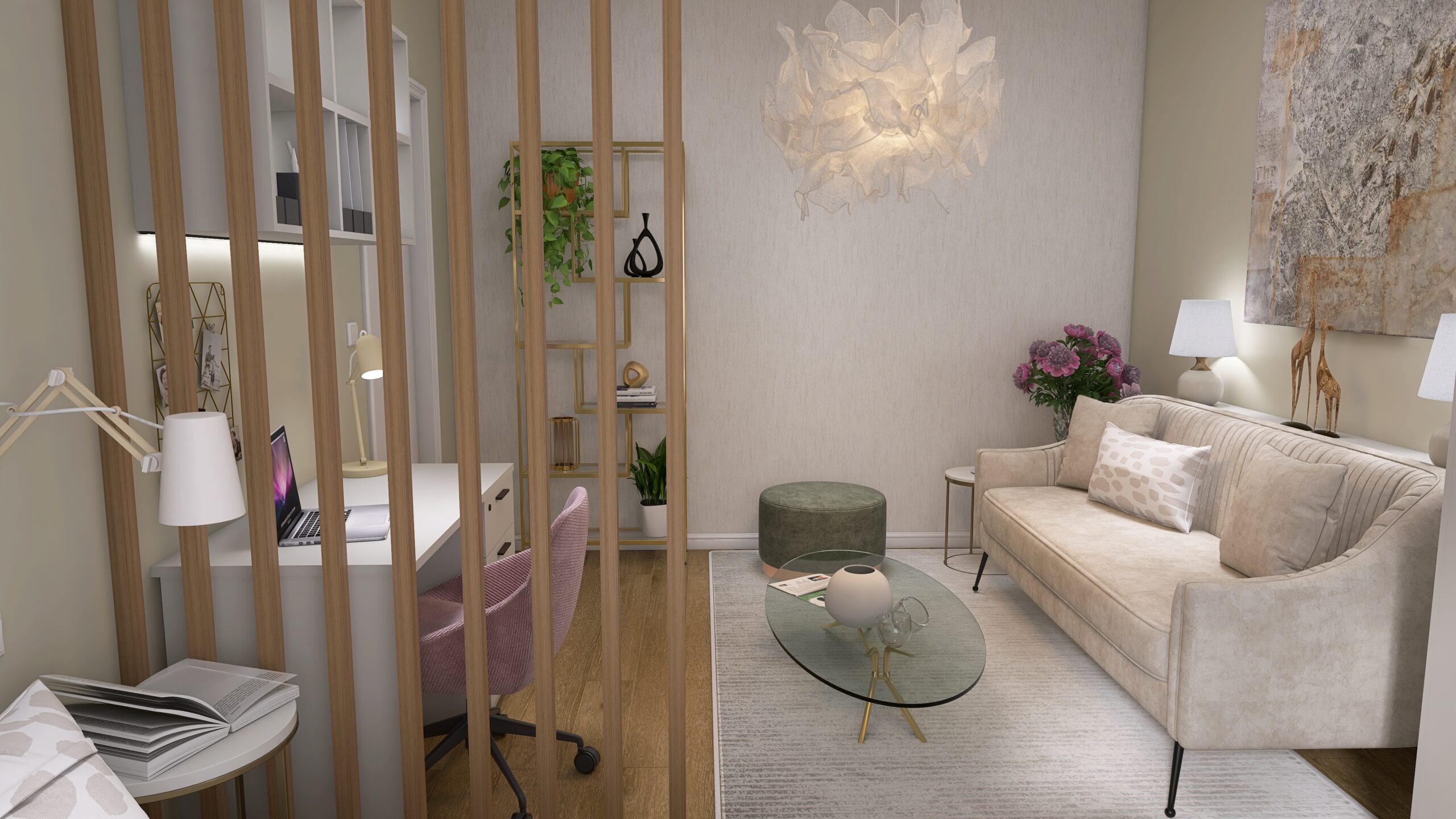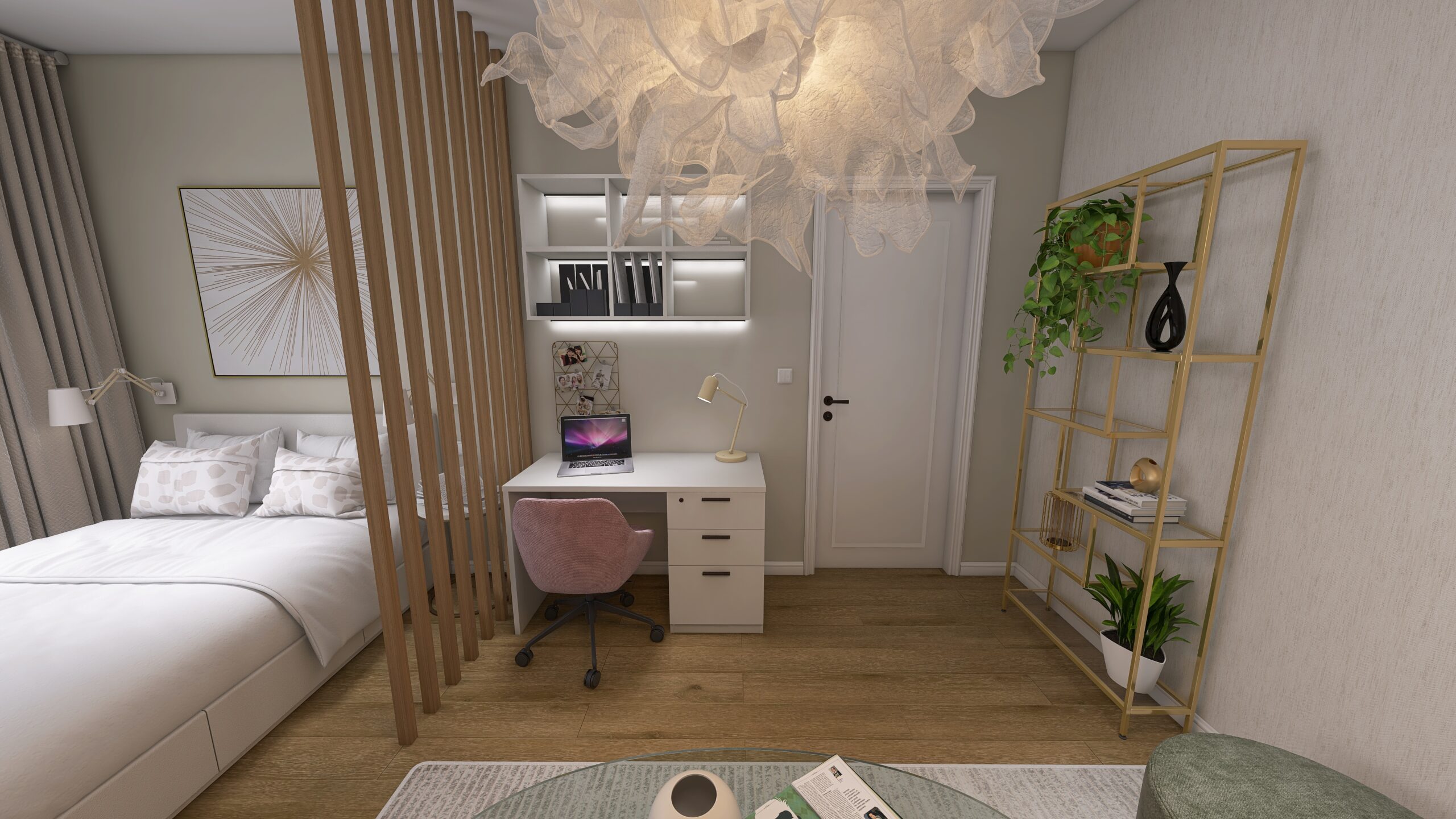 Tento priestor mal spojiť obývačku (bez TV, nakoľko ju nesleduje), malú pracovňu a spálňu – pre jednu osobu. Klietka si želala jemné farby, nič výrazné.